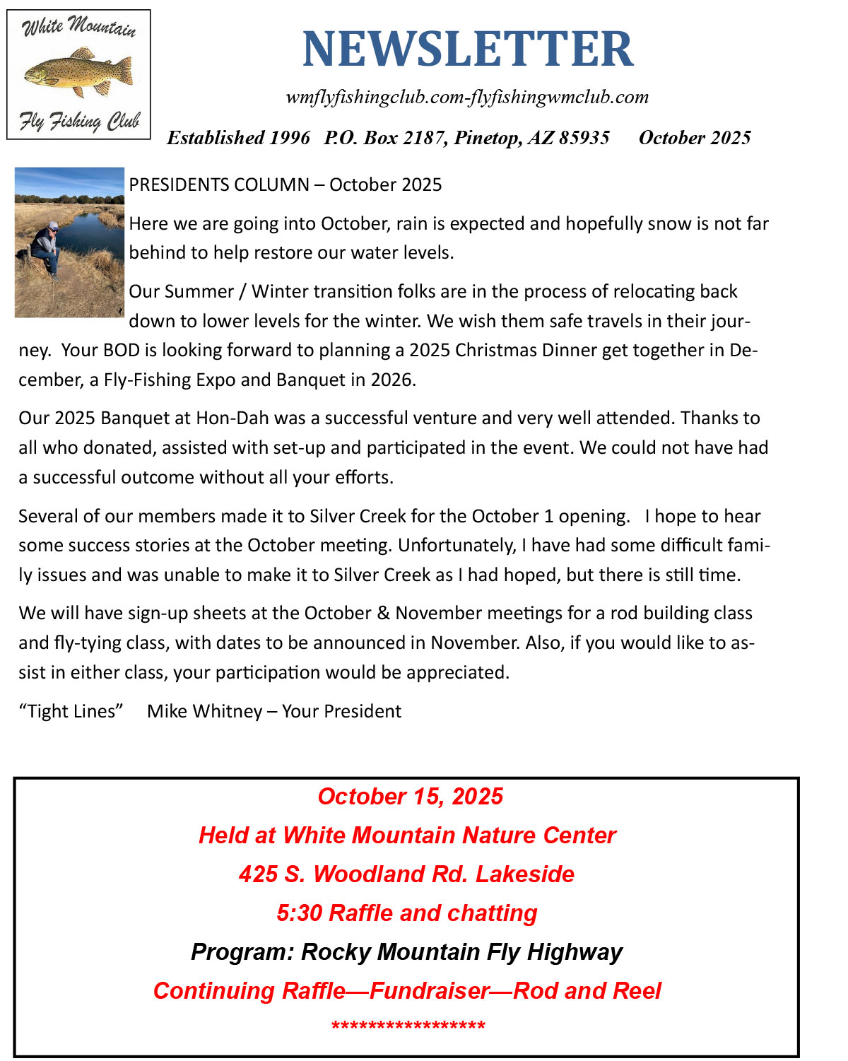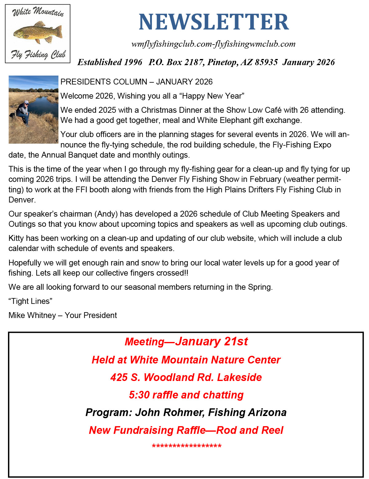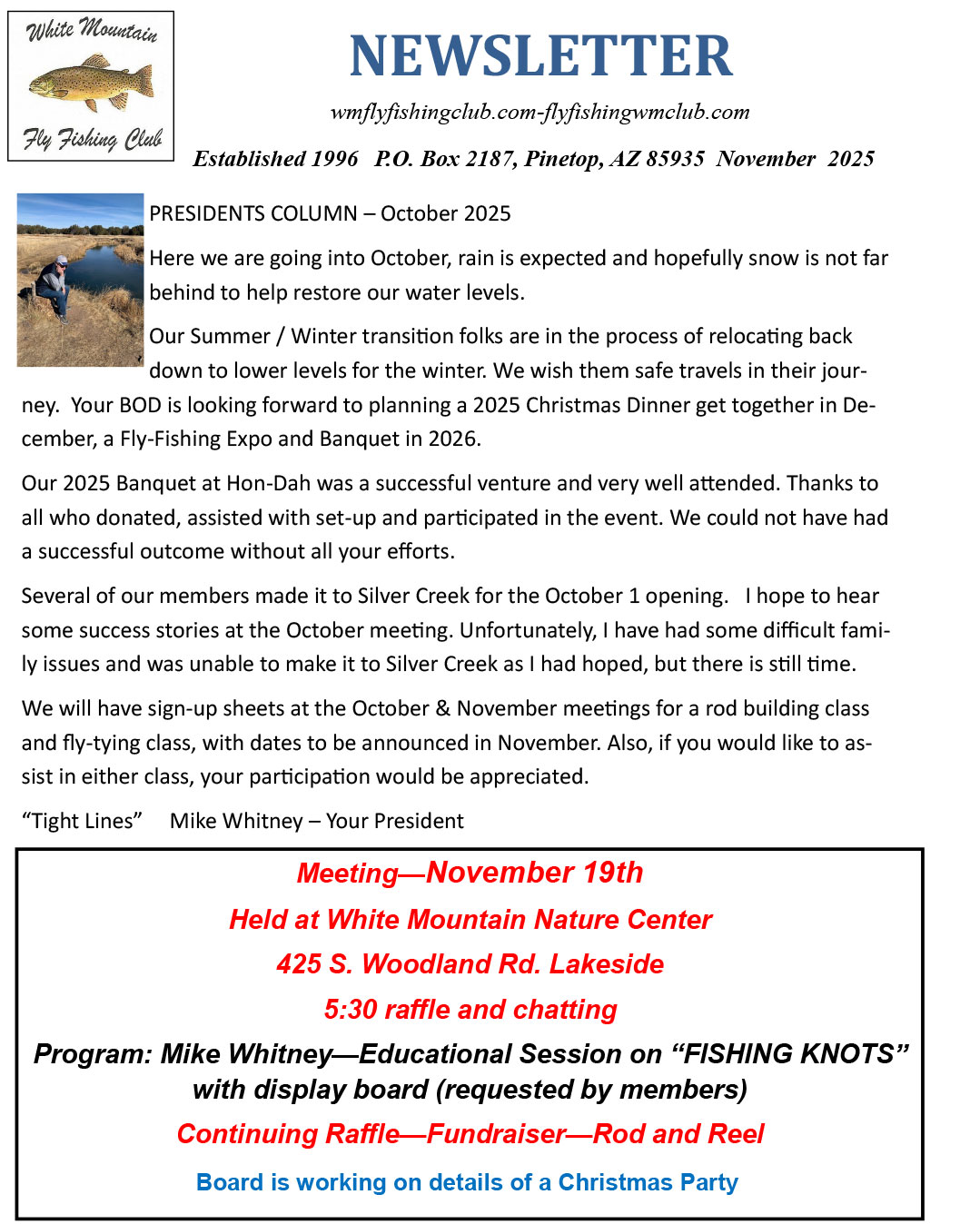 Events Calendar) at, The Nature Center, fly casting instruction, and numerous community service projects. We work with Arizona Game & Fish Department on conservation projects. We conduct Project Healing Waters training sessions annually where we teach Veterans fly tying, rod and line setup and safety, teach them casting, and take them fishing at a local stream to catch fish on flies. We sponsor... read more
